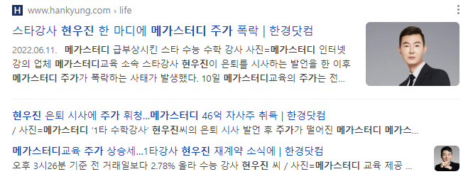 현우진 강사님 강의를 들으러 메가스터디에 들어왔다가 다른 강의도 수강하게 될 정도의 파급력을 지닌 분이며 작년에는 현 강사님의 은퇴 시사 발언에 메가스터디의 주가가 폭락한 일이 있었을 정도입니다.